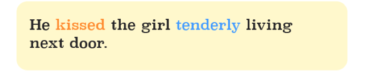 读这个句子时, 可能会懵逼, 因为这里到底 tenderly 是修饰 living 还是 kissed 呢? 所以,这个时候副词要放在动词前面: